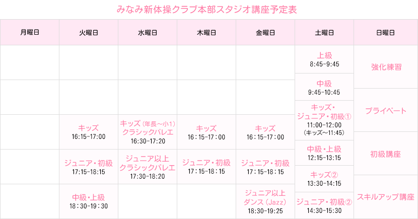 | クラス | 【火曜日】 新体操 キッズ 16:00~16:45 ジュニア以上 17:15~18:15